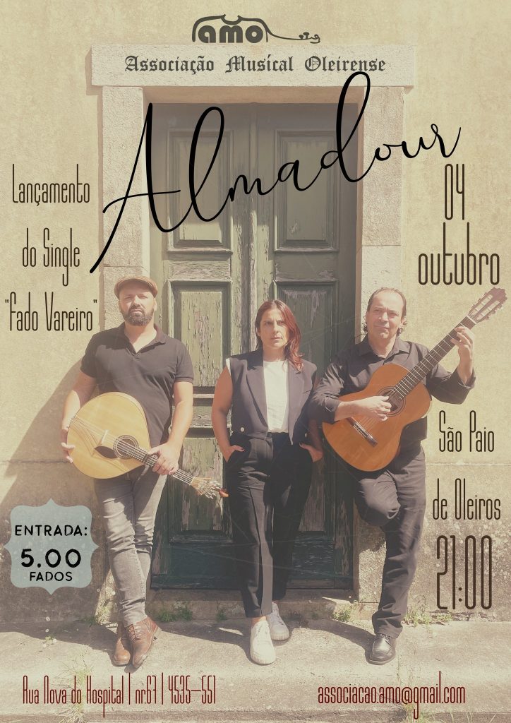 A Associação Musical Oleirense (AMO) recebe no próximo sábado, 4 de outubro, pelas 21h00, o concerto de estreia do projeto Almadour, na sede da instituição em S. Paio de Oleiros. O espetáculo terá como destaque o lançamento do single Fado Vareiro.