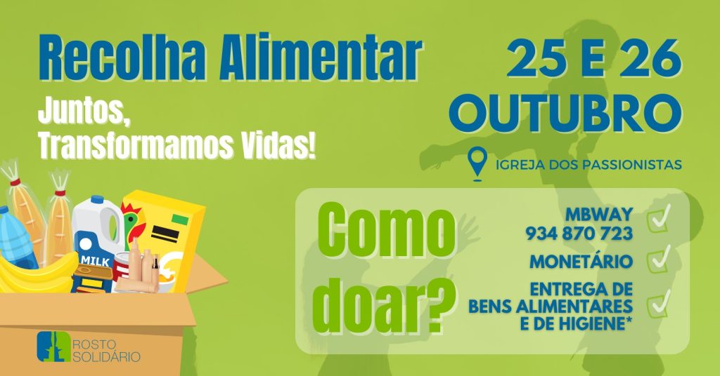 Com mais de 18 anos de trabalho contínuo na redução de situações de carência e na melhoria das condições de vida de indivíduos e famílias, a Rosto Solidário convida todos a participar através da doação de alimentos não perecíveis e produtos de higiene, que serão posteriormente distribuídos em cabazes alimentares a famílias acompanhadas pela instituição.