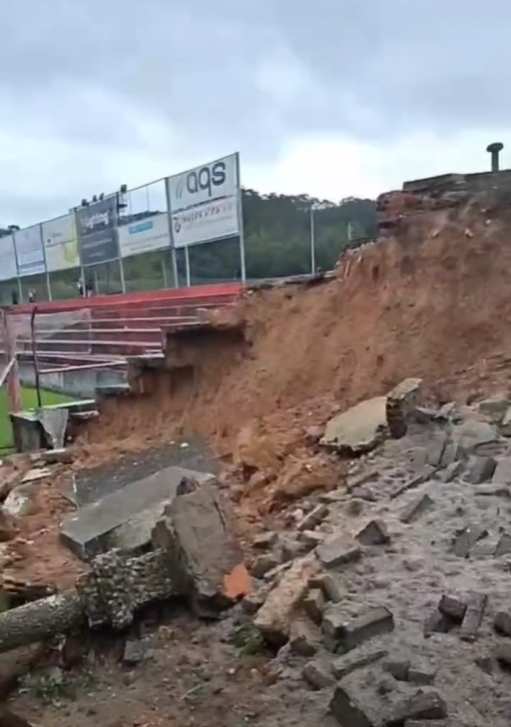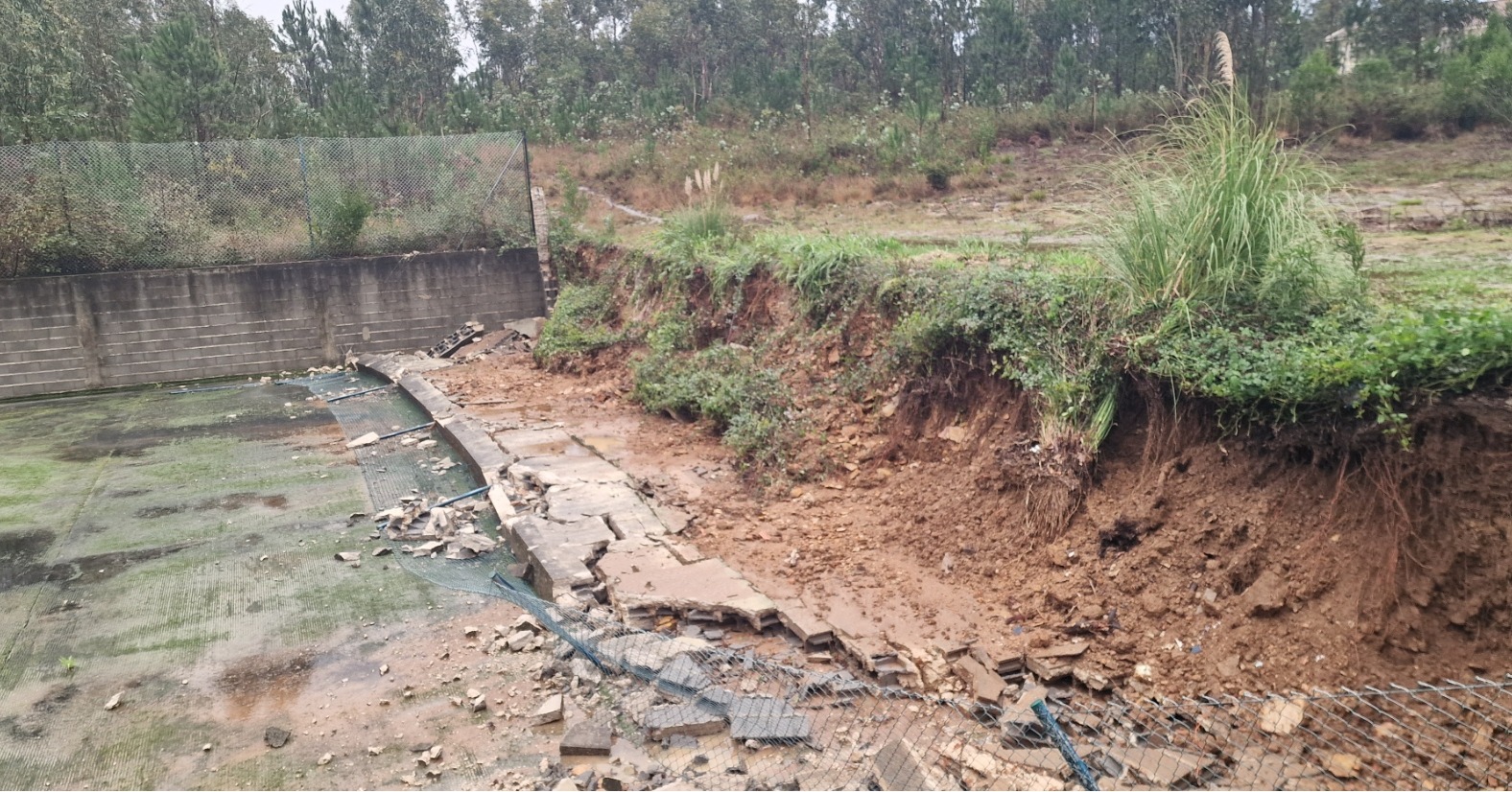 A área mais afetada foi o campo de apoio (Ringue), onde se verificou o colapso parcial do muro de contenção, erosão acentuada do terreno adjacente e danos estruturais na vedação e no pavimento.