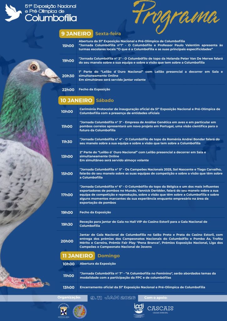 A Federação Portuguesa de Columbofilia (FPC), em parceria com a Associação Columbófila do Distrito de Lisboa (ACD Lisboa), vai realizar a 51.ª Exposição Nacional e Pré-Olímpica de Columbofilia entre os dias 9 e 11 de janeiro de 2026, no Centro de Congressos do Estoril. O evento conta com o apoio do Instituto Português do Desporto e da Juventude (IPDJ) e da Câmara Municipal de Cascais.
