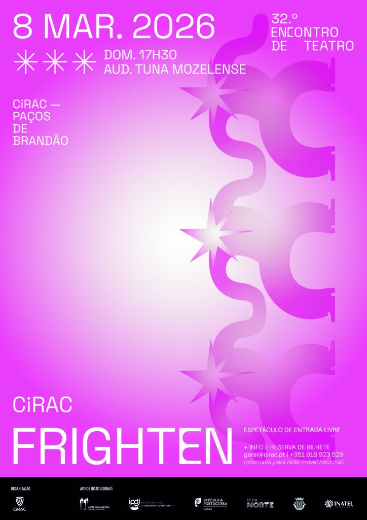 O Auditório da Tuna Musical Mozelense recebe, no próximo dia 8 de março de 2026, pelas 17h30, o espetáculo “Frighten”, integrado no 32.º Encontro de Teatro do CiRAC. A entrada é livre.
