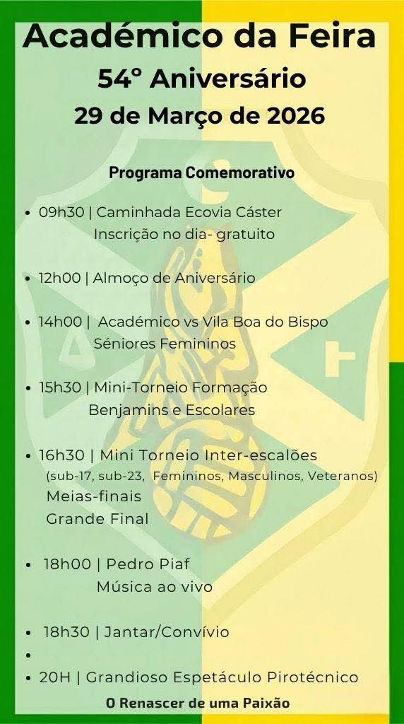 O Clube Académico da Feira celebra 54 anos de história no próximo domingo, 29 de março, com um programa diversificado que promete mobilizar atletas, sócios e comunidade ao longo de todo o dia.